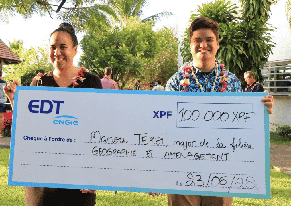 Moeana HEIMATA – ZUSCHMIDT, Responsable Développement RH a eu le plaisir de remettre un chèque de 100 000F à Manoa TEREI, major de la filière Géographie & Aménagement.